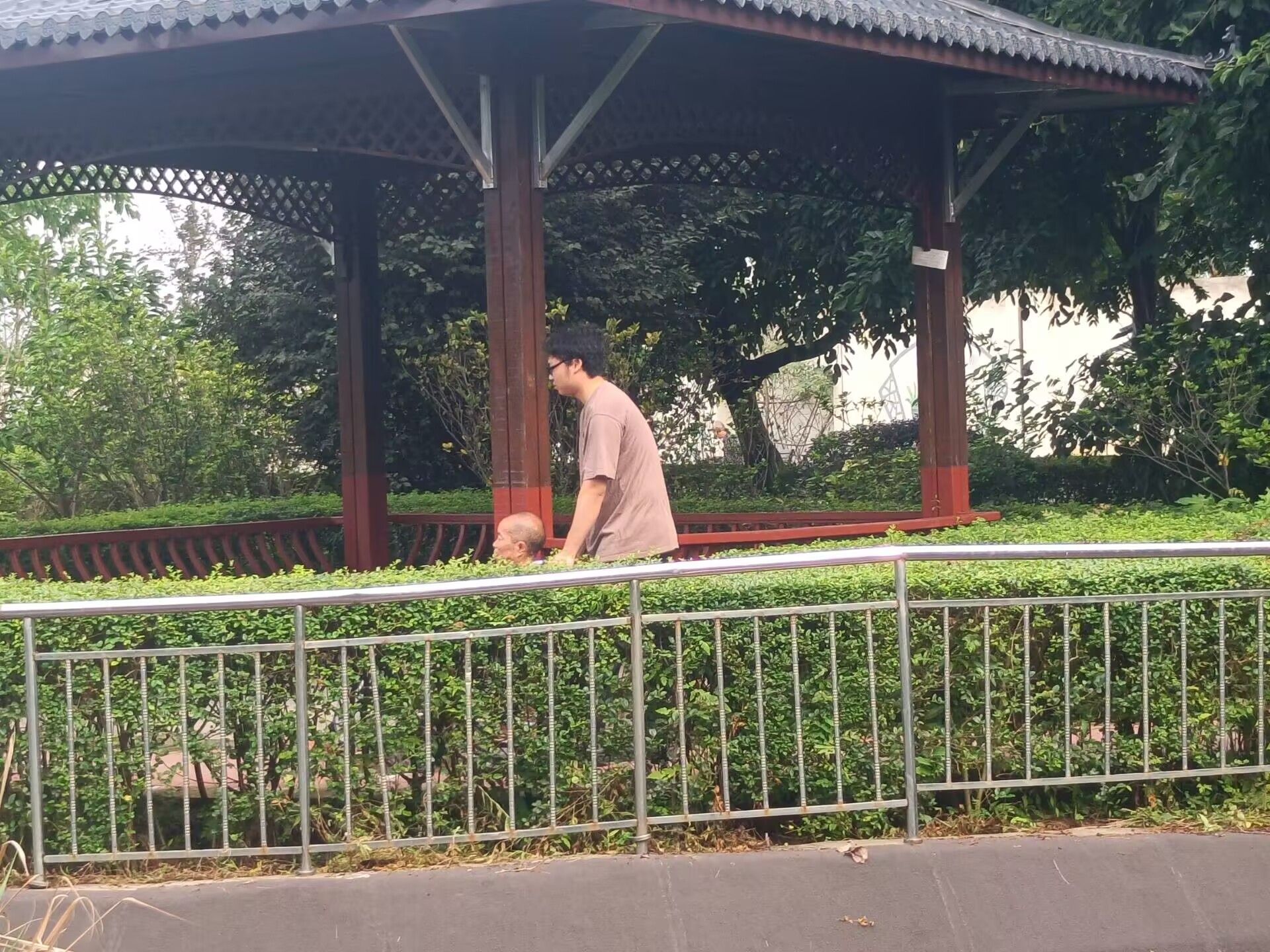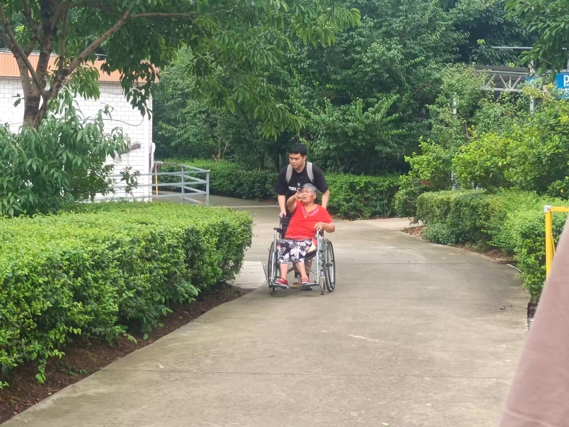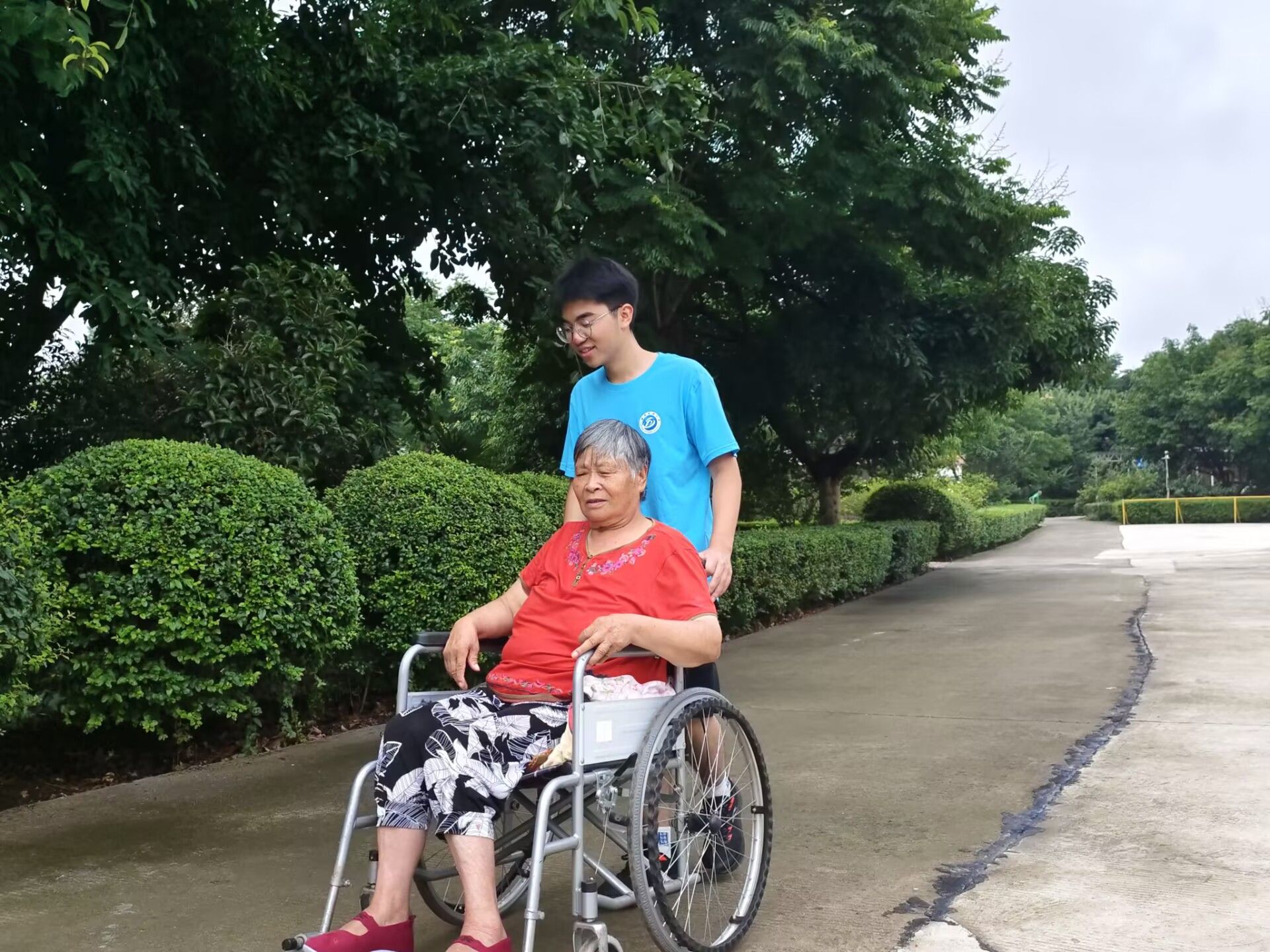 圖為志愿者推送老人路過涼亭