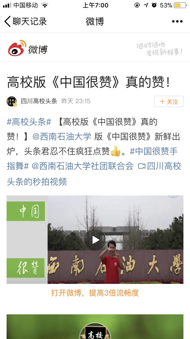 校團委副書記張維表達到:“快閃《中國很贊》手指舞完全是由同學們自發組織的,在這之前,他們還在學校各具有代表性背景的地方拍攝了舞蹈視頻,一度在網上引發熱烈反響,有效提高了我校的吸引力。青年學子用他們自己喜歡的方式為祖國加油,正如《中國很贊》歌詞里唱的那樣:‘每一個青年都努力向前,新時代的我們走向明天’,我們石大人在社會主義現代化強國建設過程中也要貢獻應有的力量和智慧。”