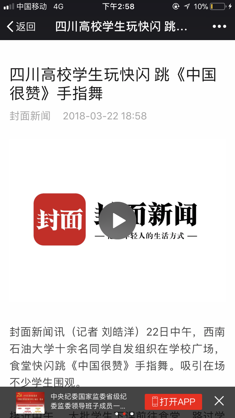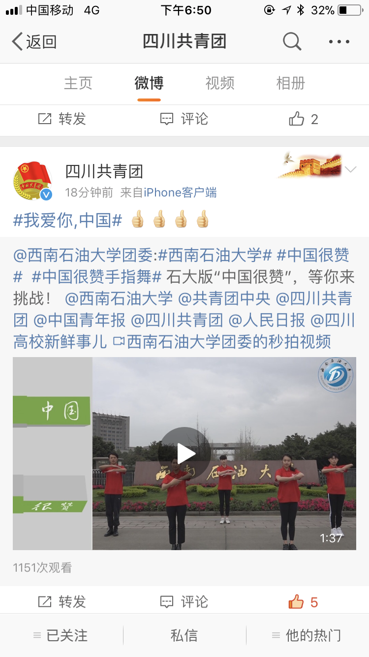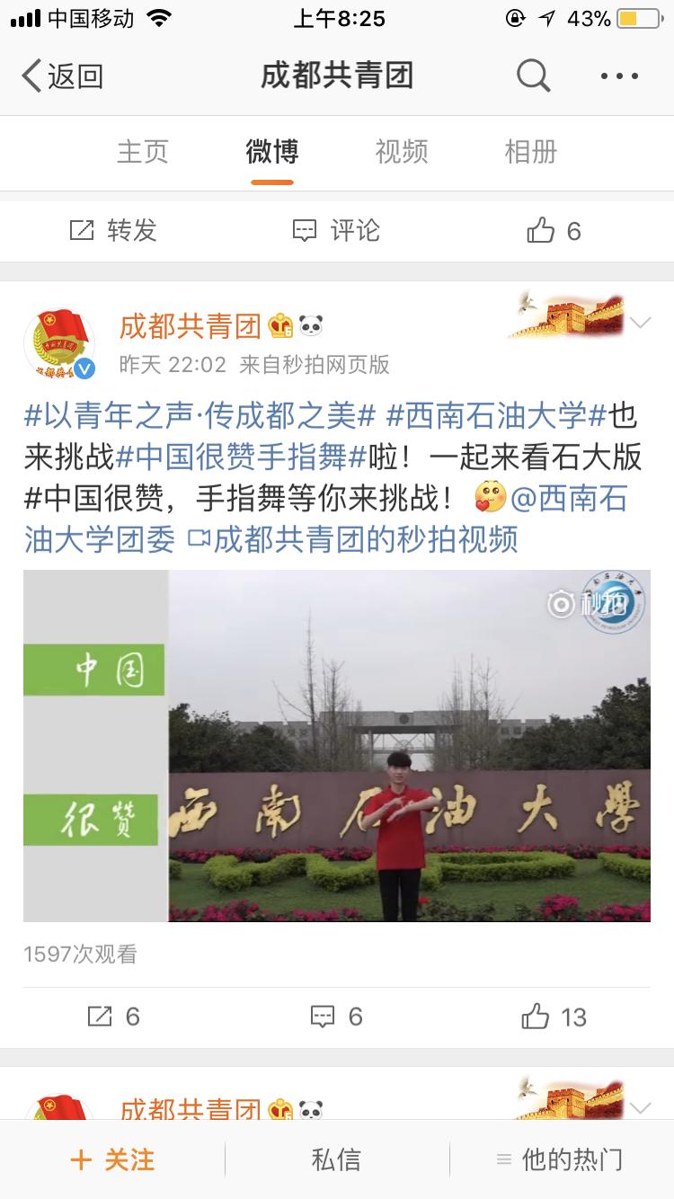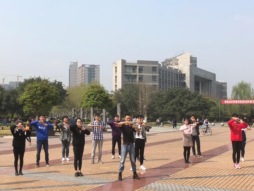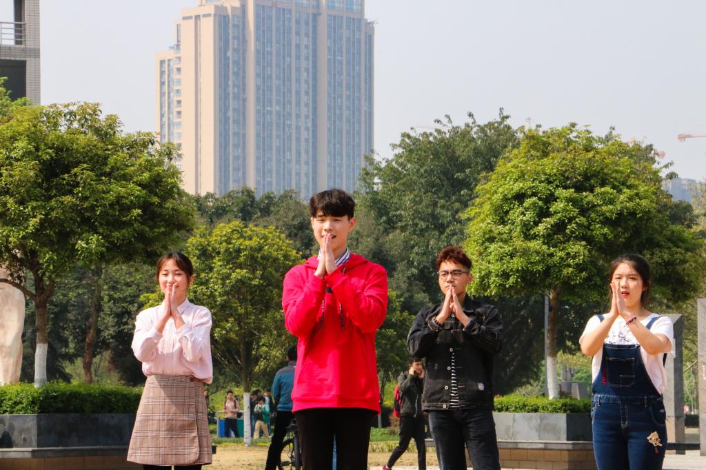 3月22日中午,我校16名同學在博學樓廣場、學生第二食堂進行 “中國點贊”快閃手指舞,為新時代中國手動點贊,現場吸引不少學生圍觀。華西都市報、新都電視臺、梨視頻等多家媒體記者跟蹤報道。