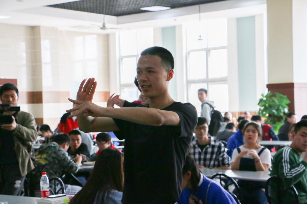 接近中午, 大批學生下課,路過博學樓廣場時,突然,音樂響起,在領舞的發動下,十余名同學陸續加入隊伍,跳起了手指舞。大概半個小時后,在學生第二食堂,當同學們正在用餐時,音樂再次響起,跳舞的同學從食堂各個角落一邊跳舞一邊聚集。部分同學停下手中的碗筷,或隨著音樂節奏一起搖擺,或給他們鼓掌。
