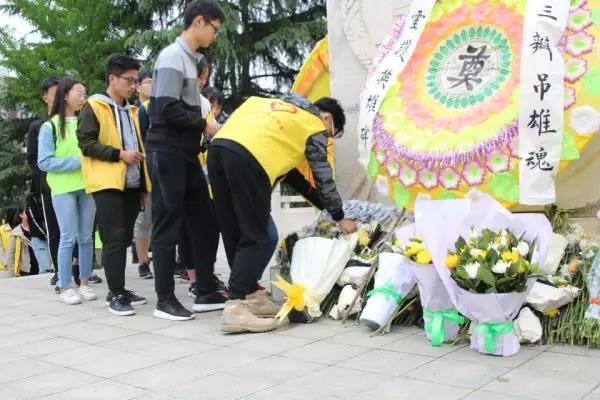 朵朵白花,寄托著同學們的哀思和悼念,時間是永恒的,信念未曾更改,不論時代如何變遷,先烈們舍生忘死、為他人謀幸福的高尚品德不應該被遺忘,他們無私奉獻的精神萬古長青!