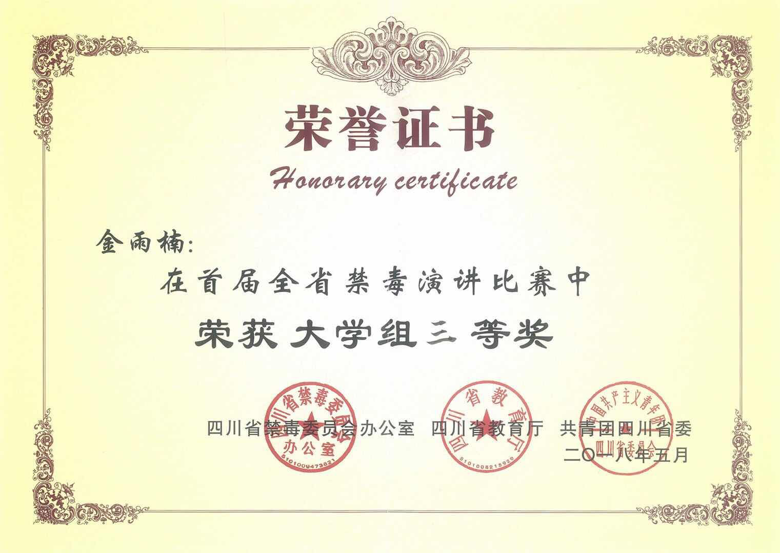 5月28日,由四川省禁毒委員會辦公室、四川省教育廳、共青團四川省委聯(lián)合舉辦的四川省首屆禁毒演講比賽決賽在四川公安廳新聞發(fā)布廳舉行,來自全省各地的200多名選手經(jīng)過初賽、全省復賽淘汰后,12名選手進入決賽激烈角逐,我校大學生藝術(shù)團選手金雨楠榮獲大學組三等獎的佳績。