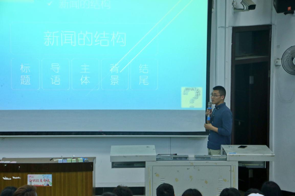 新聞寫作也是社會實踐的一項重點內容。李陽老師就“標題需醒目有力”,“主旨應重點突出”等方面提出倒金字塔的寫作方式。他強調了社會實踐宣傳工作的重要性和特點,詳細列舉了校外各大媒體及網站投稿方式,他和在場同學欣賞了社會實踐獲獎新聞,解析這些優秀新聞稿的寫作特點和獲獎原因,引申出新聞價值的關鍵點和新聞的表現形式。最后以校內各類新聞稿撰寫舉例,進行評析改進。
