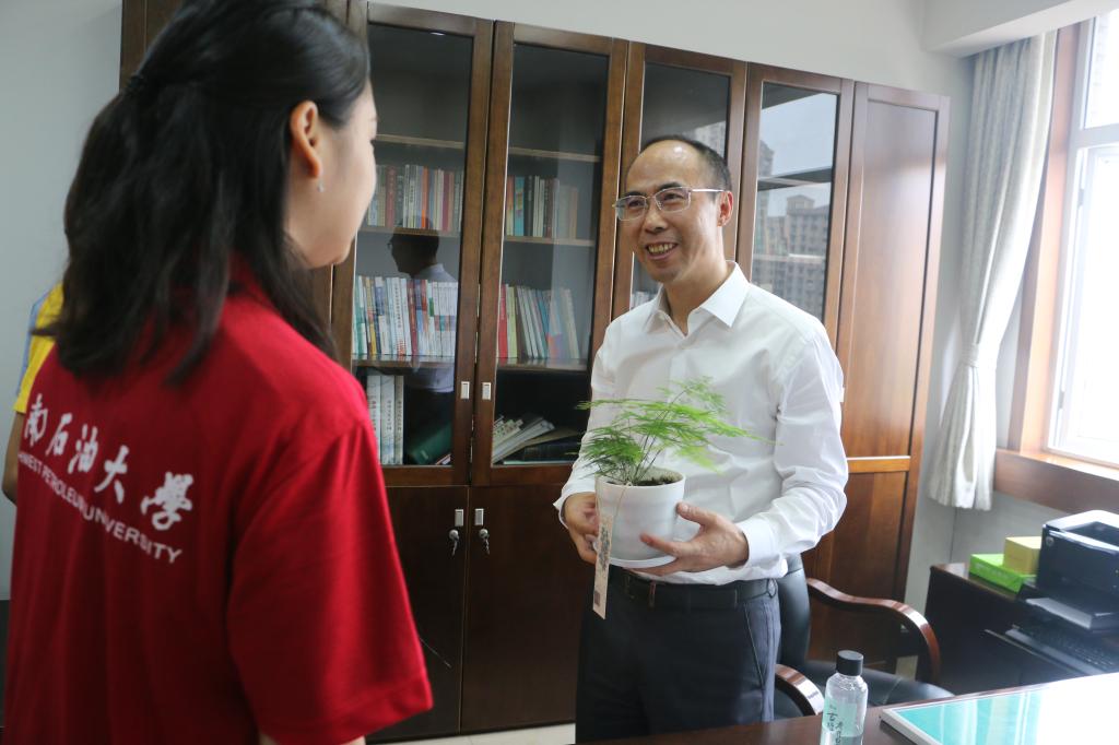 學生會和學生社團聯合會代表全體青年學生滿懷真誠與喜悅走進校領導的辦公室,用溫馨的卡片、自己培育的綠植,和一聲飽含真情的“老師,您辛苦了”表達青年學生對老師最誠摯的祝福。學生會見習主席團張心怡祝福黨委書記孫一平老師芬芳滿園、桃李天下。社團聯見習主席范道全向校長趙金洲老師說道:這些綠植都是我們社團的同學們自己培育的,他們精心呵護,就像老師平日對我們的栽培,今天,我們也將自己的成果送給趙校長。趙校長親切的問候了同學們的姓名,學院,并寄語他們“在奮斗中成長”;黨委副書記趙正文老師對同學們表示感謝,同時祝福學生會和社團聯發展得越來越好。