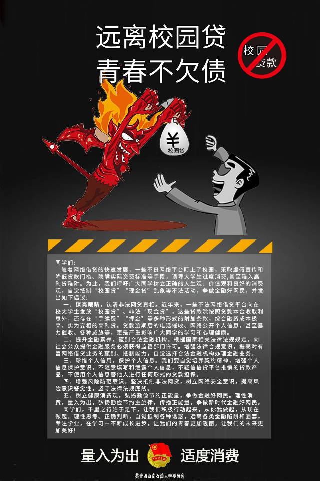 隨著網絡借貸的快速發展,一些不良網絡平臺盯上了校園,采取虛假宣傳、降低貸款門檻和隱瞞實際資費標準等手段,誘導大學生過度消費,甚至陷入高利貸陷阱。“高額罰息”“裸條催收”“跳樓自殺”等惡性事件在高校多發,產生了極為惡劣的社會影響,嚴重侵犯了同學們的合法權益,對同學們的身心健康及成長造成極大傷害,不得不引起同學們高度警醒。為此,我們呼吁廣大同學樹立正確的人生觀、價值觀和良好的消費觀,自覺抵制“校園貸”“現金貸”亂象等不法活動,爭做金融好網民,并發出如下倡議: