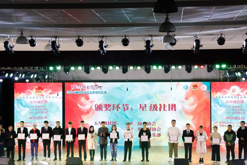 晚會現場同時進行了星級社團表彰,新社團授旗儀式。另外,我校綠舟協會、知源愛心協會在中國青年報社舉辦的“尋找全國高校百強學生社團”活動中脫穎而出,榮獲“最佳學生社團”和“優秀學生社團稱號”,在晚會上被授予特別貢獻獎。
