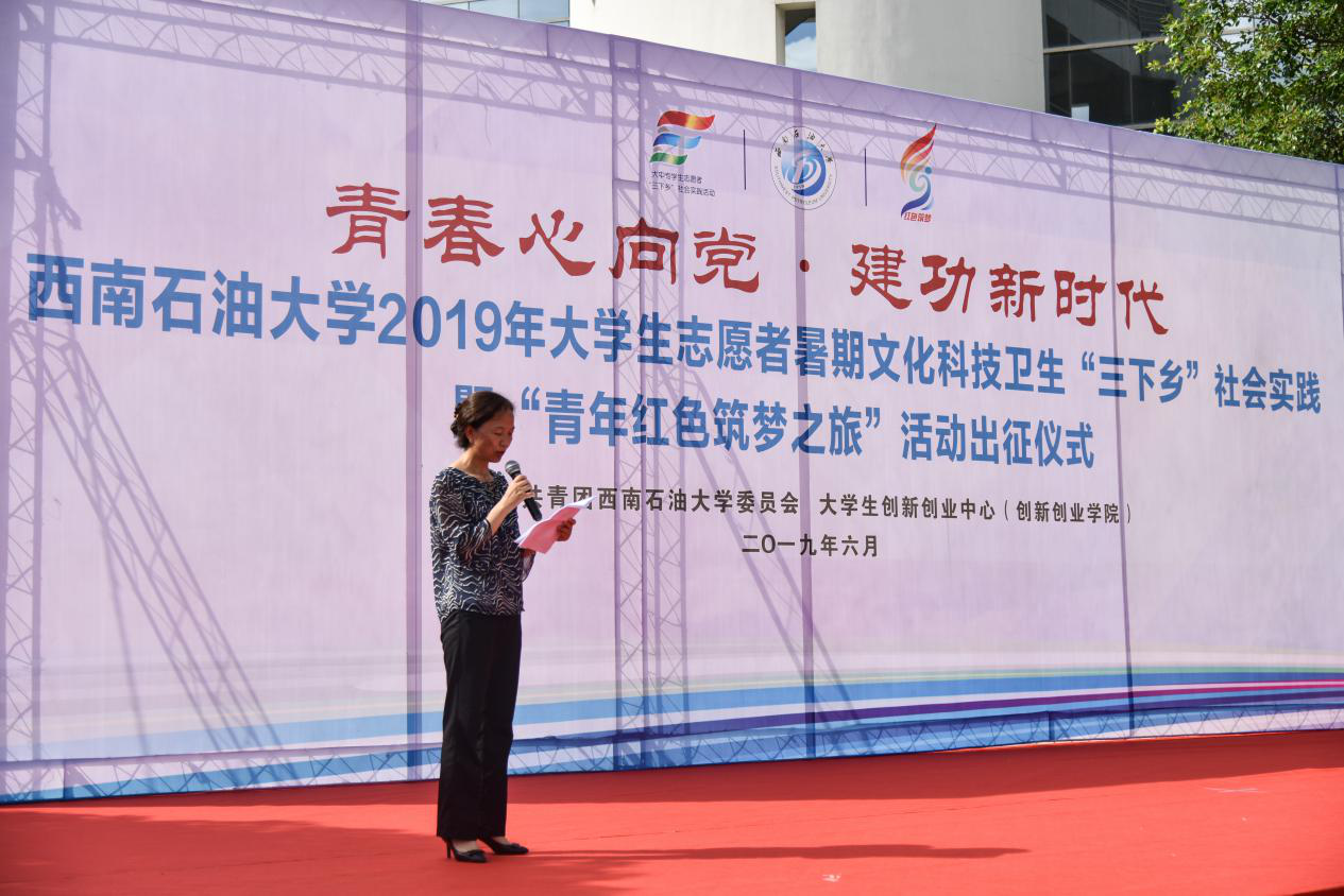 6月27日下午,我校2019年大學生志愿者暑期文化科技衛(wèi)生“三下鄉(xiāng)”社會實踐暨“青年紅色筑夢之旅”活動出征儀式在博學廣場舉行。學校黨委常委、副校長劉向君,宣傳部副部長曹正,學生工作部部長蒲勇,教務處處長黃健全,招生就業(yè)處處長張敏,大學生創(chuàng)新創(chuàng)業(yè)中心主任姚遠,心理發(fā)展與服務中心主任方可,馬克思主義學院院長張小飛,校團委書記夏艷及各學院黨委副書記、團委書記和青年志愿者代表出席出征儀式。