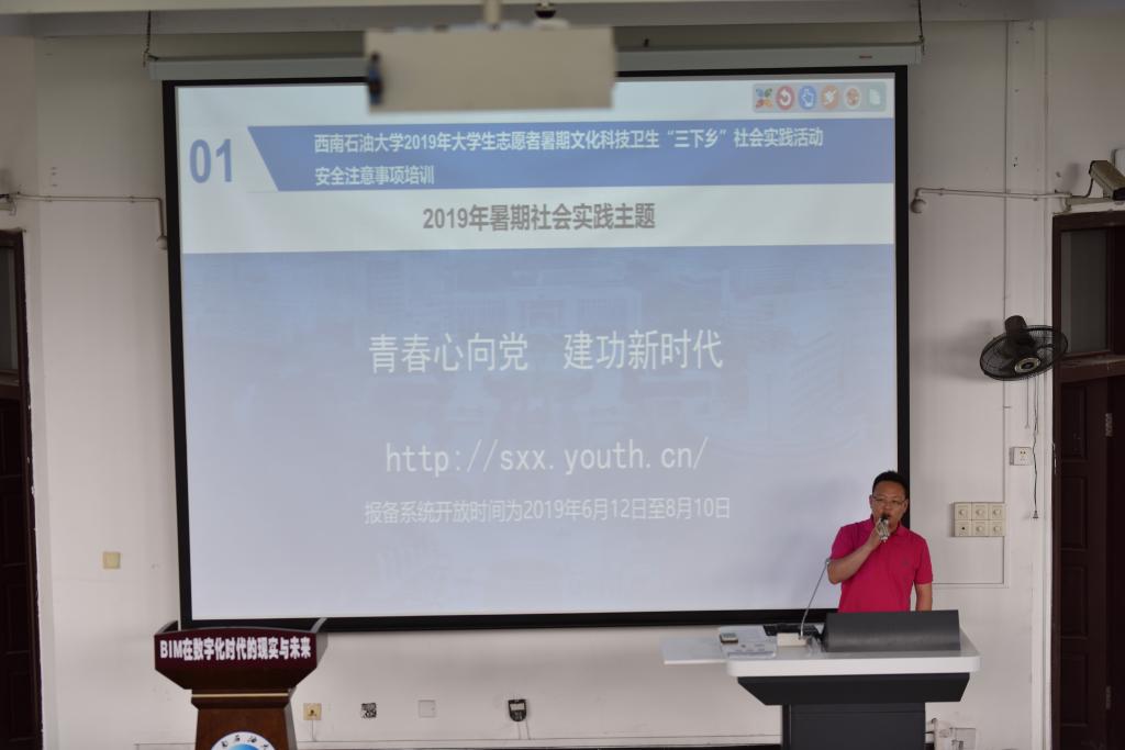7月4日下午,西南石油大學(xué)2019年大學(xué)生志愿者暑期文化科技衛(wèi)生“三下鄉(xiāng)”社會(huì)實(shí)踐暨“青年紅色筑夢(mèng)之旅”活動(dòng)安全動(dòng)員大會(huì)在思學(xué)樓A220舉行。黨委宣傳部老師李陽,校醫(yī)院老師廖香瓊,校團(tuán)委副書記張維,校團(tuán)委老師溫登峰出席為參加暑期社會(huì)實(shí)踐的同學(xué)進(jìn)行社會(huì)實(shí)踐相關(guān)事宜培訓(xùn)。