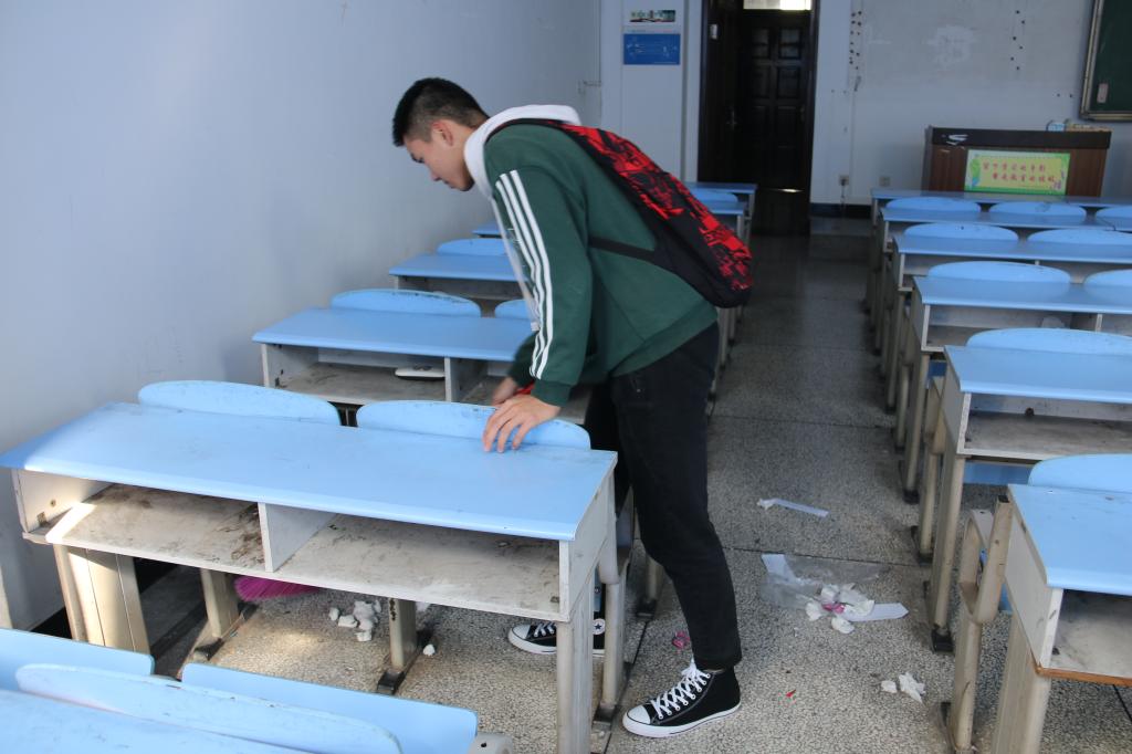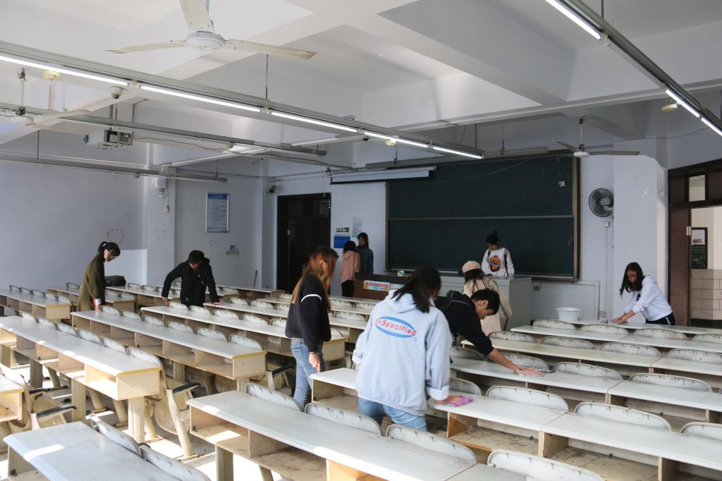 勞動過程中,同學(xué)們不怕臟不怕累,積極行動,分工合作。掃地,拖地,擦黑板,擦桌椅,彰顯了“愛校如家”的良好精神風(fēng)貌,用自己的雙手建設(shè)出了窗明幾凈、環(huán)境優(yōu)美的校園環(huán)境。校青志協(xié)、各學(xué)院青志協(xié)高擎志愿服務(wù)大旗,在各自的清潔區(qū)積極開展校園衛(wèi)生清掃、單車整理、看臺維護(hù)等工作。身著黃馬甲的“小黃人”成為了教學(xué)樓、學(xué)子感恩林、自行車停靠區(qū)、足球場等校園角落里最靚麗的一道風(fēng)景線。