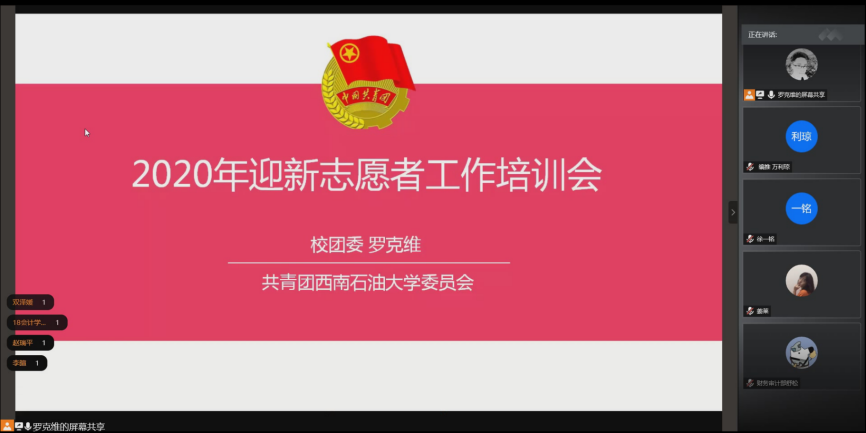 金秋九月,又是一年迎新時。為做好我校研究生新生報到服務(wù)工作,校團(tuán)委于9月6日下午2:30召開了2020年迎新志愿者工作線上培訓(xùn)會。校醫(yī)院老師鄒劍戎,校團(tuán)委副書記張維以及全體志愿者參會,會議由校團(tuán)委老師羅克維主持。