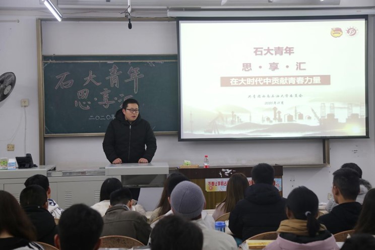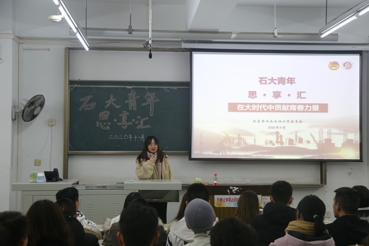 11月29日晚19:00,石大青年“思享匯”在思學樓A318舉辦。2020年四川省“青馬工程”高校班班長、成都市大中骨干培訓班班長、我校石工院2019級博士研究生申鑫,2020年四川省“青馬工程”高校班宣傳委員、我校石工院2019級碩士研究生李艷擔任主講人。