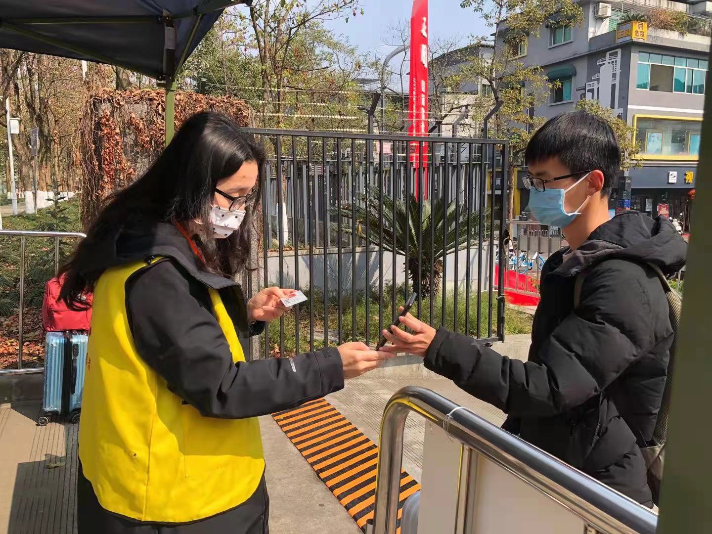 在這柳枝吐翠,乍暖還寒的時節,我們迎來了新學期。2月20-28日是我校學生分批返校日,為貫徹落實疫情防控要求,保障我校2021年春季開學返校工作圓滿順利,引導廣大同學安全有序分批返校復學,全校各級團學組織、學生骨干、學生黨員積極響應團委號召,組建了一支由100多人組成的“小黃人”志愿服務組參與返校志愿服務工作。志愿者們在帶隊老師的帶領下,引導返校同學有序出示校驗碼,維持校門人流秩序,幫助學生搬運行李,為我校為30000多名“小柚子”安全有序返校全力以“復”,保駕護航。一句句“歡迎回校,請出示校驗碼”,一聲聲“我幫你拿,請往這邊走”,是此次志愿服務工作中最美的聲音。