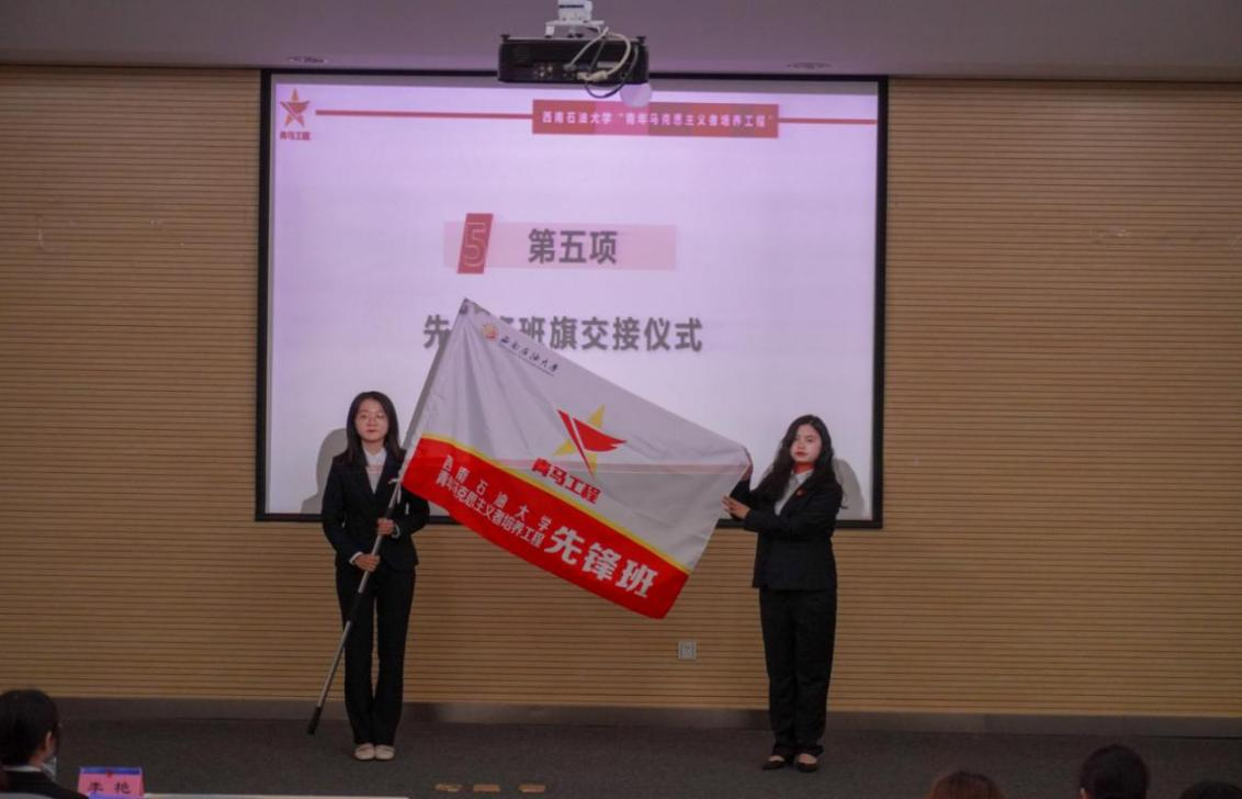 隨后,先鋒班兩期學生代表進行班旗交接,巴金宇同學代表先鋒班第2期學員發言。她呼吁大家擔當時代責任,不忘初心跟黨走,在磨礪中讓青春出彩,讓人生在奮斗中升華,并代表全體學員鄭重承諾,將會認真學習、用心感悟,做一名合格的青年馬克思主義者,不負韶華,綻放青春。