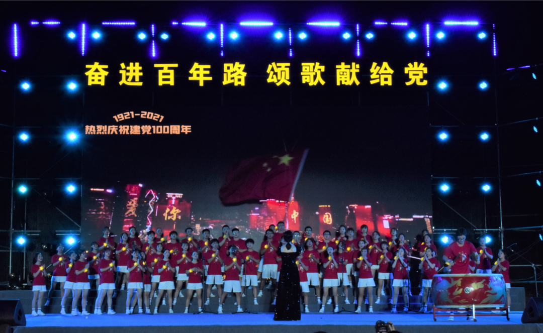 晚會最后,全場師生齊唱《沒有共產黨就沒有新中國》,一起用心底最美的歌聲贊美偉大的黨,獻禮黨的百年華誕。在歌聲中,一面寫有“永遠跟黨走”的巨幅旗幟在觀眾席中傳遞,大家揮動著手中的國旗和黨旗,唱響最美的祝福,把整場晚會推向高潮。