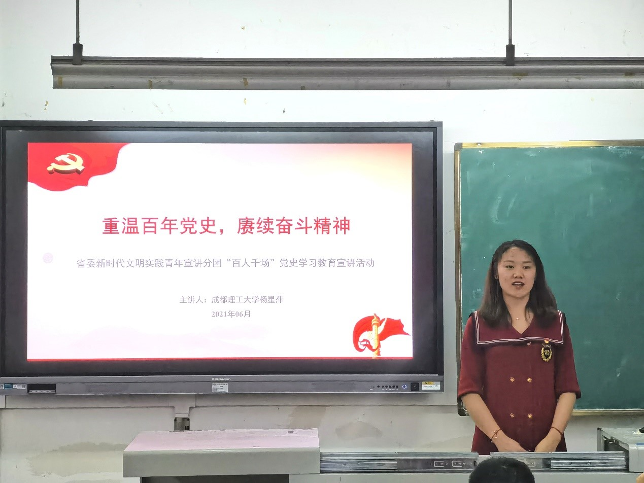 本次宣講活動嘉賓為西南民族大學(xué)黑來仁信和成都理工大學(xué)楊星萍同學(xué),她們均為四川省第三屆“青馬工程”高校班成員,主講過多次黨史學(xué)習(xí)教育宣講活動,并多次獲得省部級及以上榮譽。她們分別以傳承紅色基因和重溫百年黨史為主題,并結(jié)合自身經(jīng)歷,深刻講述了對黨百年征程的感悟。