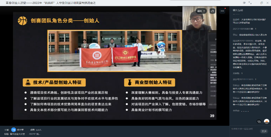 講座伊始,宋志成通過分享自己的參賽經歷,用樸實的語言和生動的故事,鼓勵參賽師生,天上不會掉餡餅,幸福是都“拼”出來的。隨后,他從賽道選擇、政策解讀兩個方面,詳細講述了“挑戰杯”大學生創業計劃競賽的注意事項。通過對部分國賽金獎項目的深入解析,號召同學們要堅守傳統、銳意創新,要突出“實用”,努力提高參賽項目的受眾面。接著,宋志成著重對參賽項目網評標準、創業團隊構建和商業企劃書撰寫等進行了細致介紹。他強調,從2020年開始,“挑戰杯”大學生創業計劃競賽較之以前的“創青春”大學生創業大賽,有了新的變化,參賽團隊要抓住評分要點,不斷優化項目材料,精益求精,主動契合大賽的設立意圖。對于創業團隊構建,他認為,參賽團隊成員對創業項目的價值觀趨同是構建團隊的核心前提,高功能性異質性是團隊多維度思考、全面構建項目的重要保障,適度社會性異質性是保障參賽團隊氛圍良好、關系和諧的關鍵紐帶。商業企劃書是項目從無到有、從小到大、從弱到強、從強到盛全面完整的“作戰圖”。一定要尊重客觀真實,要把握參賽項目的內在邏輯關系和外界相關聯動,申報表是商業企劃書的高度濃縮,20頁的項目展示PPT更是濃縮中的精華,因此,要格外的引起高度重視。最后,宋志成通過線上互動的形式,與廣大參賽師生進行了深度的交流。