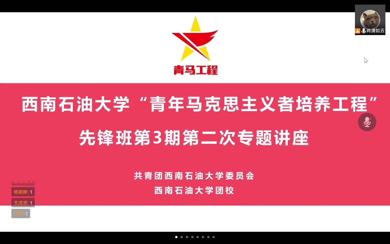 4月23日晚,西南石油大學“青馬工程”先鋒班第3期青年教育主題講座在線上順利舉辦,本次講座邀請四川大學馬克思主義學院講師石立春擔任主講嘉賓。講座由“青馬工程”先鋒班第3期班主任肖瀟如云主持,先鋒班第3期全體學員參與學習。