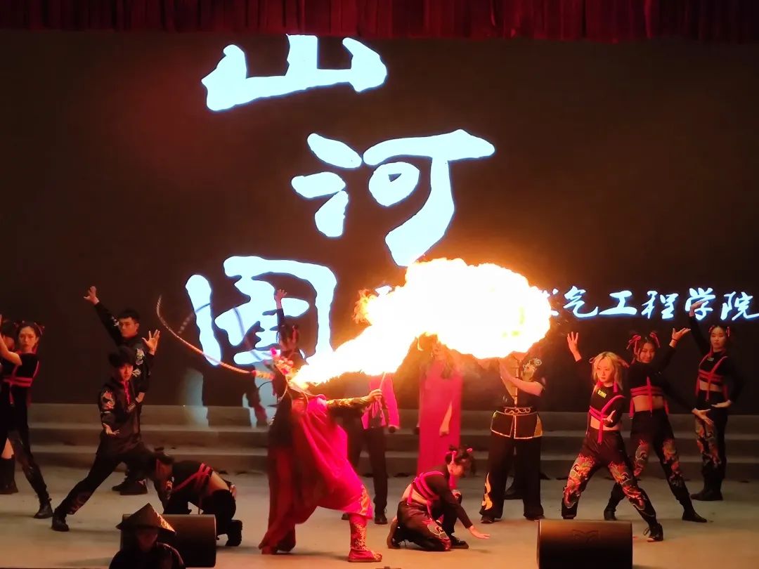 歌舞《山河圖》的表演可謂是貫徹一個“燃”字。石工院的學生鳴鼓起樂,大氣磅礴的舞蹈令人感受到的是祖國山河的遼闊,引起振奮引發共情。而其中川渝的文化代表川劇變臉的出現讓人驚艷、感嘆。節目結尾的“噴火”表演為節目畫上句號,寓意祖國紅火。