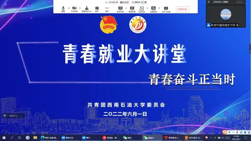 為進一步落實“共青團促進大學生就業(yè)行動”相關工作,幫助學校2022屆畢業(yè)生更好地適應工作崗位,努力提升已成功考取選調(diào)生學生群體的工作能力,端正他們的工作態(tài)度,幫助他們贏得工作先機。 6月1日19:00,由校團委、招生就業(yè)處主辦,校社團聯(lián)承辦的青春就業(yè)大講堂“青春奮斗正當時”——選調(diào)生成長經(jīng)驗分享會,依托“騰訊會議”平臺在線上順利舉行。講座由成都市雙流區(qū)新經(jīng)濟和科技局政策法規(guī)科副科長、學校2017屆通信工程專業(yè)畢業(yè)生于洋分享。