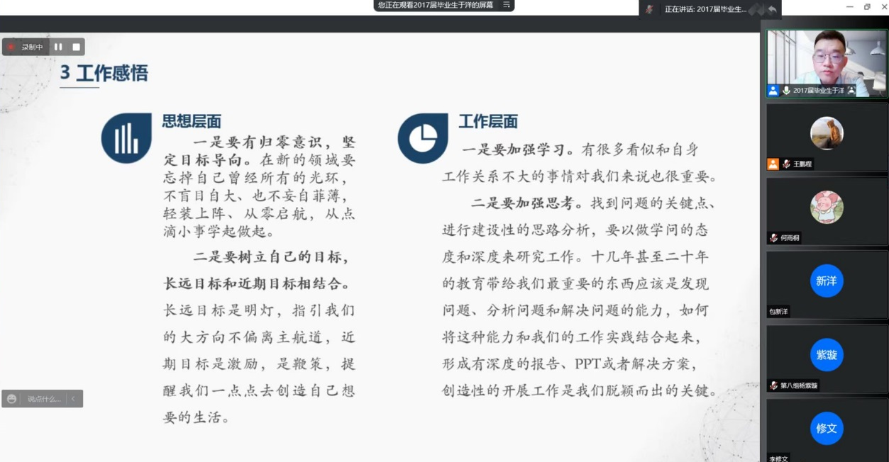 于洋學長從擇業(yè)、工作、感悟三個方面,分享了他從選調(diào)生錄取到不斷成長的過程,與同學們重溫了自己選調(diào)生考試的過程,幫助大家進一步厘清選調(diào)生的各種相關政策,誠摯地歡迎廣大青年學生投身到基層工作中,貢獻青春力量。在擇業(yè)時,他分享了畢業(yè)后想去看看最真實的中國,選擇了到基層鍛煉自己;在工作時,他介紹了自己通過多崗錘煉,復合成長,鼓勵自己走出固有的關系網(wǎng),“逼迫”自己不斷學習,努力提高綜合素質(zhì)的寶貴經(jīng)歷;在感悟環(huán)節(jié),他與大家共勉,要清楚“成人和成熟”“能做事和會來事”的重要區(qū)別,要在等待的日子里,刻苦讀書,謙卑做人,養(yǎng)得深根,日后才能枝葉茂盛。