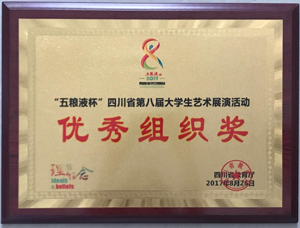 2017年8月21日,由四川省教育廳主辦的四川省第八屆大學生藝術展演活動在四川理工大學隆重舉行。我校大學生藝術團報送的五項表演類節目和一項書畫作品均獲佳績。《飛翔》榮獲合唱甲組一等獎、《家鄉》榮獲器樂甲組二等獎、《如果明天就是下一生、藍藍的夜藍藍的夢》榮獲合唱甲組二等獎、《青春獻石油》榮獲舞蹈甲組二等獎;《紅途》榮獲戲劇甲組二等獎;國畫《志存高遠》榮獲美術作品甲組三等獎。學校榮獲優秀組織獎。