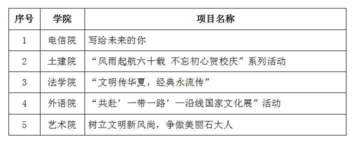 經各學院代表答辯,現場投票后決定,在14項申報項目中選定5項作為“一院一品”校級團學精品活動;在13項申報項目中選定5項作為“素質拓展”校級團學精品活動。具體項目名單公布如下: