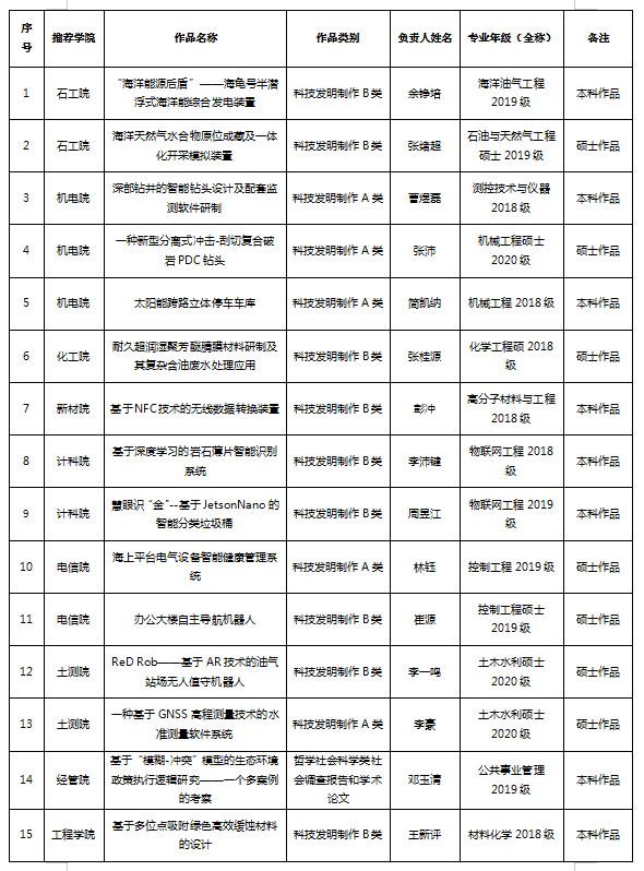 根據團中央和團省委的相關通知要求,學校組織開展了2021年“挑戰杯”西南石油大學大學生課外學術科技作品競賽,經過項目申報、資料審核、院級初審推薦、校級復審、綜合評議等環節,擬定推薦以下15件作品參加“挑戰杯”省級競賽。按照要求,現將推薦作品的相關信息公示如下(排名不分先后):
