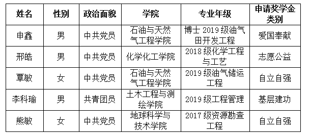 根據(jù)團(tuán)省委《關(guān)于推報(bào)2020年度“中國大學(xué)生自強(qiáng)之星”獎學(xué)金人選的通知》的文件要求,經(jīng)個人申報(bào)、學(xué)院團(tuán)委推薦、校團(tuán)委評審,擬決定5名同學(xué)為 “中國大學(xué)生自強(qiáng)之星”推薦人選。現(xiàn)將名單予以公示: