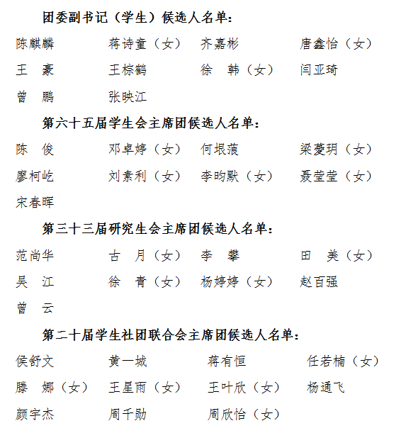 按照《關于開展校團委直屬學生組織、校學生會(研究生會)、校學生社團聯合會換屆的通知》要求,經資格審查、筆試、面試和綜合評議等環節,現將校團委直屬學生組織、校學生會(研究生會)、校學生社團聯合會主席團候選人名單公示如下:(按姓氏拼音排序,排名不分先后)