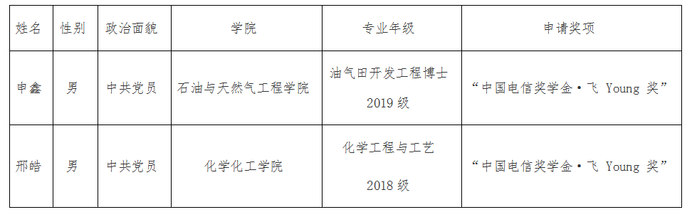 根據團省委《關于推報2021年度“中國電信獎學金”人選的通知》的文件要求,經個人申報、學院團委推薦、校級評委會評審,擬決定2名同學為“中國電信獎學金·飛Young獎”推薦人選。現將名單予以公示: