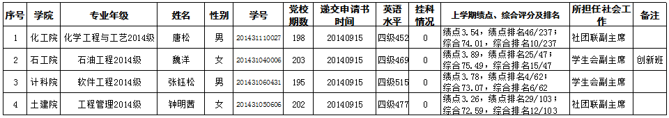 根據學校發展學生黨員基本要求,經過前期調研,結合符合入黨基本條件的學生干部平時工作情況和所關聯學生匿名投票結果,校團委黨支部擬于近期向相關學院推薦以下優秀學生干部為中共預備黨員,現將其基本情況予以公示,在公示期內,歡迎廣大師生通過電話,信涵或直接到校團委反映公示對象的思想品德以及現實生活表現等情況。