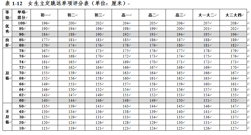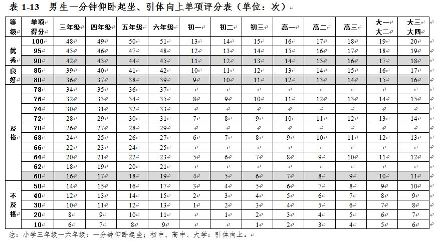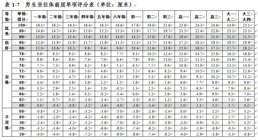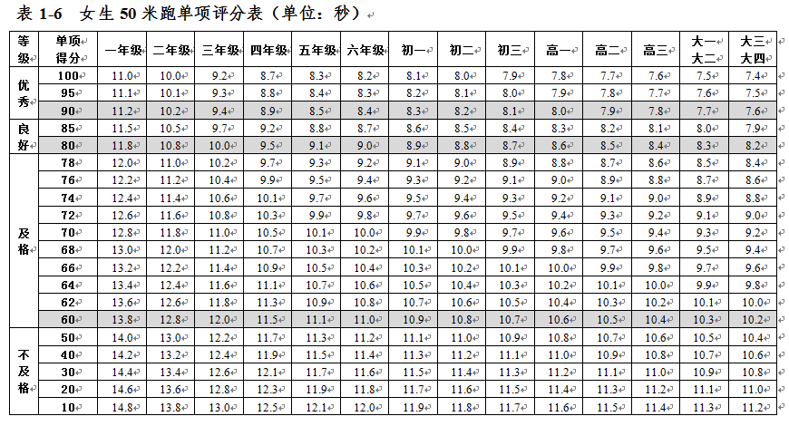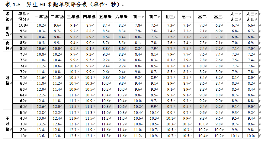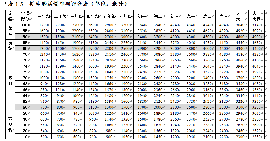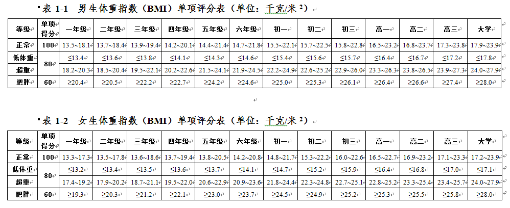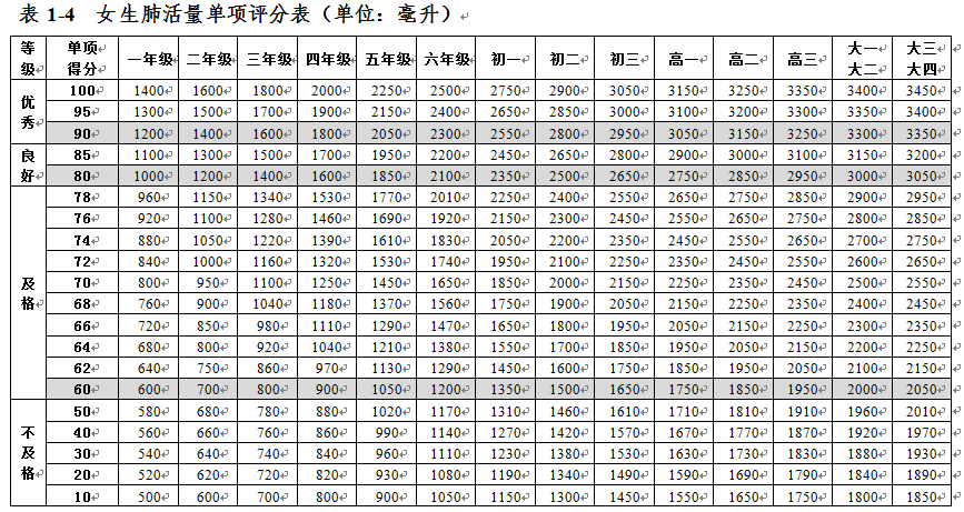 大學生體質健康測試各項指標評分表