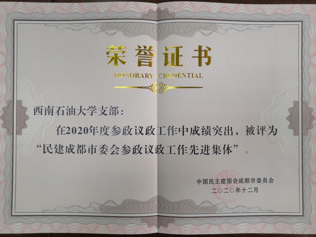 近日,民建成都市委會(huì)十四屆五次全委(擴(kuò)大)會(huì)議在蓉召開(kāi)。會(huì)上,民建西南石油大學(xué)支部被授予“五個(gè)好”基層組織,并獲得了民建成都市委會(huì)參政議政工作先進(jìn)集體、組織工作先進(jìn)集體,民建支部主委吳曉明獲慶祝中國(guó)民主建國(guó)會(huì)成立75周年評(píng)選表彰活動(dòng)優(yōu)秀會(huì)員、抗擊新冠肺炎疫情工作先進(jìn)個(gè)人。民建成都市委會(huì)主委仰協(xié),民建四川省委會(huì)監(jiān)督委員會(huì)委員宋良華等出席會(huì)議。