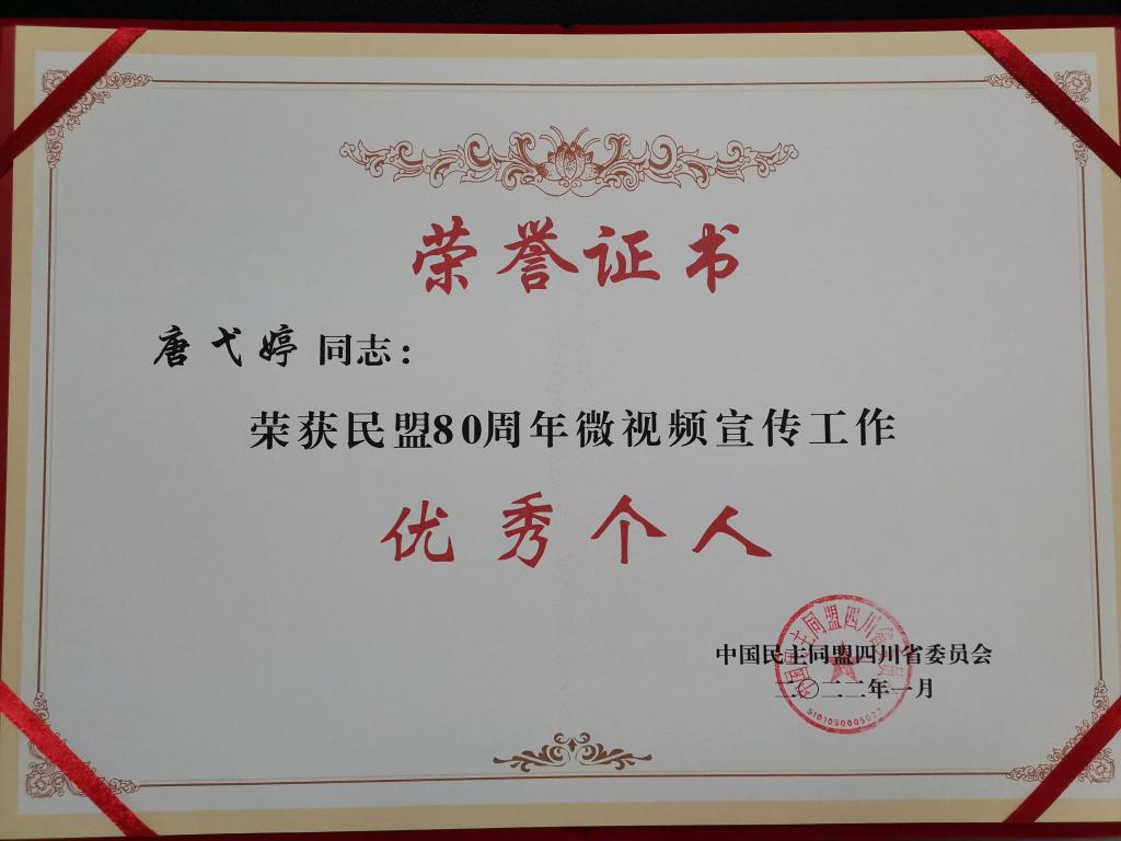 2021年,為大力弘揚優秀傳統,展示盟員風采,講好中國故事,中國民主同盟四川省委員會開設“民盟80年”微視頻專欄,集中展示發布各地盟組織報送作品,根據綜合點擊率、點贊量以及微視頻質量等,對民盟省委會展播的所有主題微視頻進行評選。唐弋婷的作品《獻禮民盟 80 周年——媽媽,女兒也入盟了》成功入選,唐弋婷個人也因此被民盟省委會授予慶祝民盟80周年微視頻宣傳工作優秀個人。