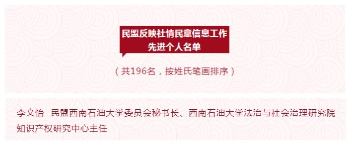 近日,民盟西南石油大學委員會秘書長、西南石油大學法治與社會治理研究院知識產權研究中心主任李文怡等全國196位盟員和專職干部受到民盟中央反映社情民意信息工作先進個人表彰。