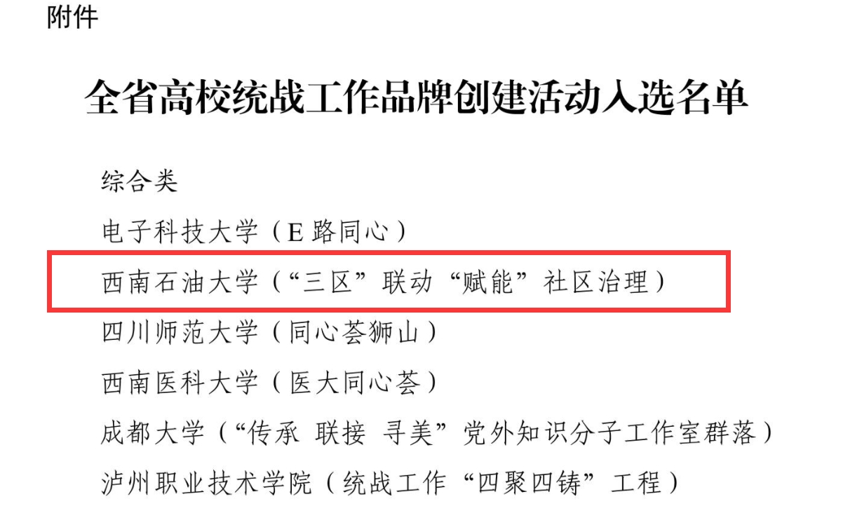 近日,中共四川省委教育工委下發《關于公布全省高校統戰工作品牌創建活動入選名單的通知》(川教工委函〔2023〕118號),遴選出15個高校統戰工作品牌。我校黨委統戰部申報的“‘三區’聯動‘賦能’社區治理”統戰品牌成功入選。