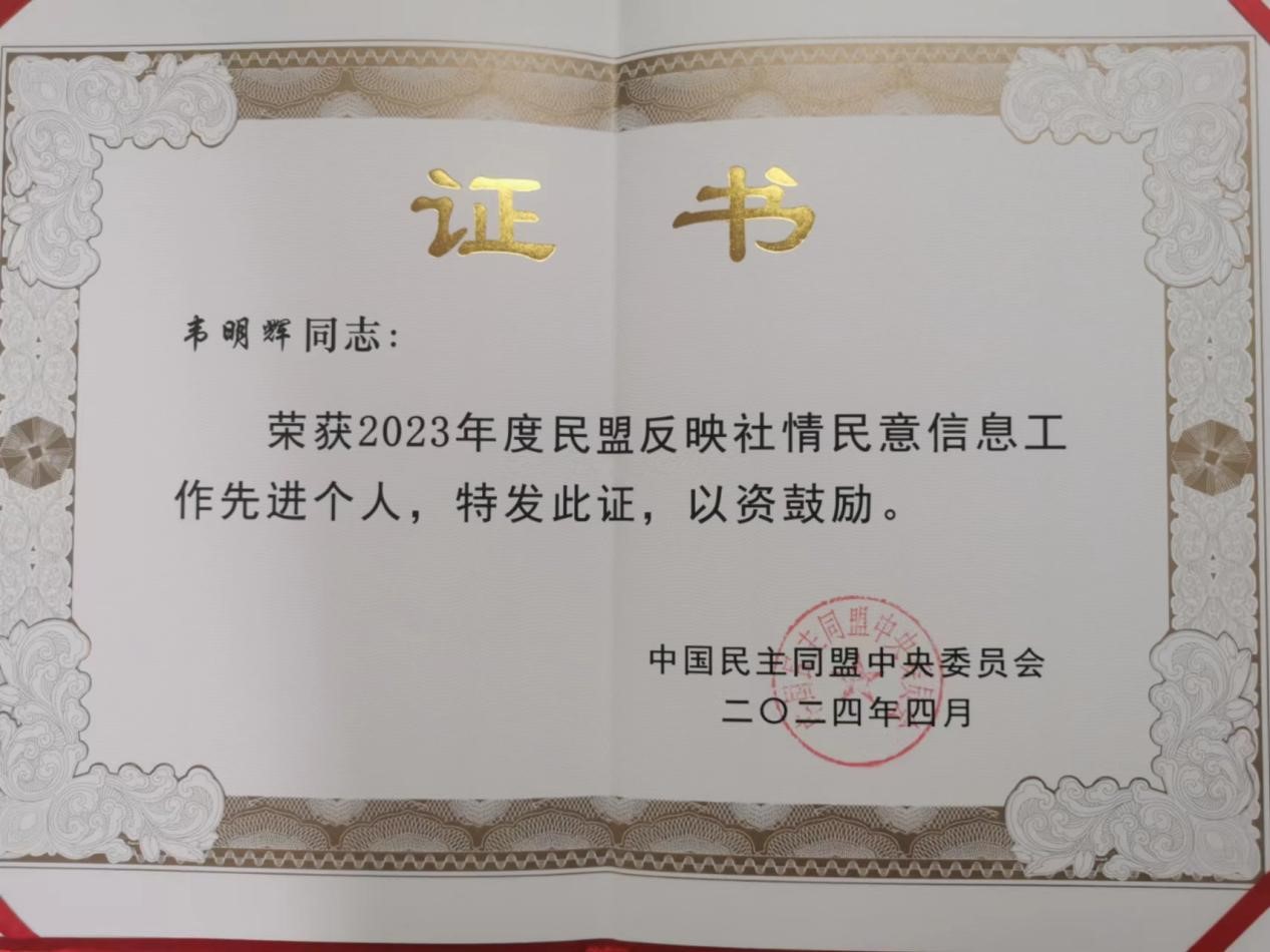 2023年,韋明輝圍繞黨和國家重點關切積極反映社情民意,建言成果多次被全國政協、四川省政協,民盟中央委員會、民盟四川省委員會采納。