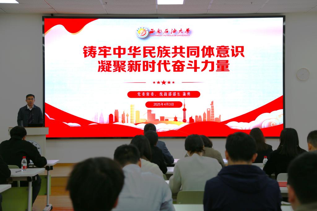 活動現場,蒲勇作了《鑄牢中華民族共同體意識,凝聚新時代奮斗力量》的專題報告。他向在場師生娓娓道來:“從紅軍長征過彝區(qū)到三千孤兒入內蒙,中國共產黨始終把‘中華民族一家親’寫在治國理政的扉頁。”他通過“百戰(zhàn)百勝的回民支隊”“三千孤兒”等黨史故事,將“四個與共”“五個認同”的理論精髓化作可觸可感的生動故事。