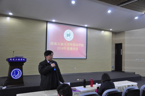 為了提升學院師生的詐騙防范意識和防范能力,外國語學院在明志樓B105組織開展了以法治為主題的道德講堂活動,邀請了成都市新都區人民法院速裁庭庭長孫豐法官做了題為“防范詐騙,誠信立身”的專題報告。學院全體教師和學生代表200余人聆聽了報告,學院黨委書記杜宗良主持活動。