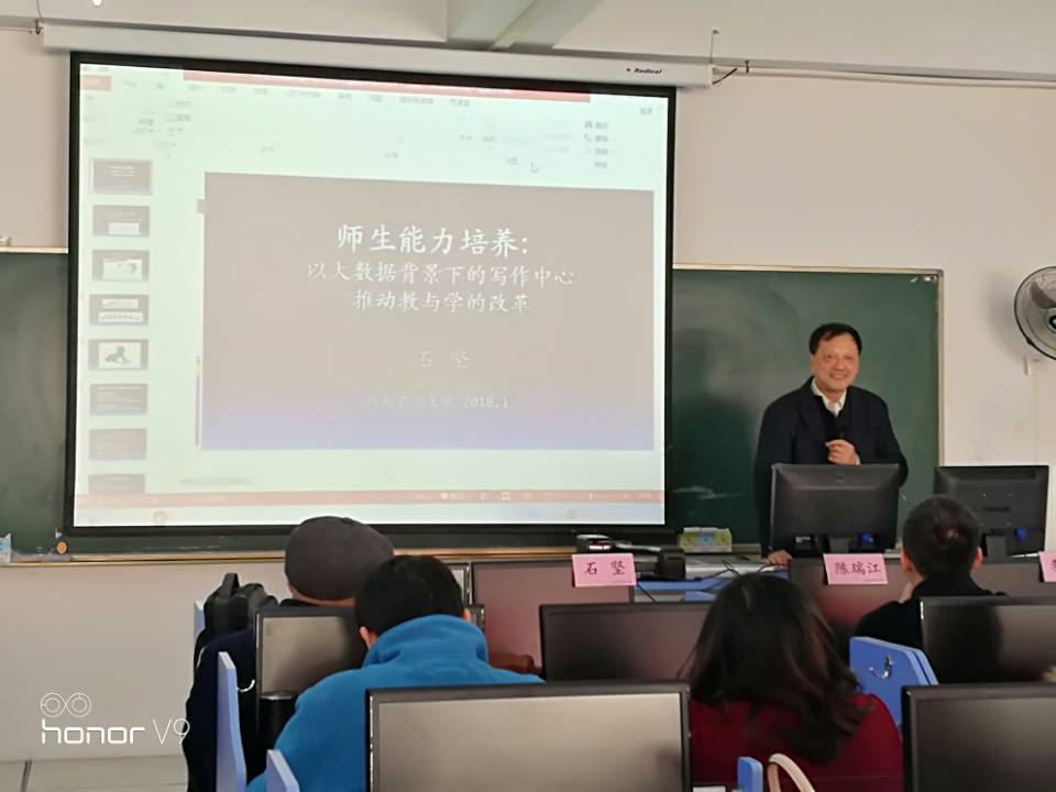 石堅(jiān)教授講座圍繞“師生能力培養(yǎng):以大數(shù)據(jù)背景下的寫(xiě)作中心推動(dòng)教與學(xué)的改革”的主題,從大數(shù)據(jù)時(shí)代和外語(yǔ)教學(xué)研究的關(guān)系、外語(yǔ)教學(xué)發(fā)展方向、人才培養(yǎng)方向和途徑以及大數(shù)據(jù)帶來(lái)的機(jī)遇與意義等方面展開(kāi)講解。他首先闡釋了大數(shù)據(jù)時(shí)代的定義和表現(xiàn)。他指出,大數(shù)據(jù)時(shí)代下信息科學(xué)發(fā)展迅猛,人工智能的崛起更是不容小覷。他表示,教育界即將引來(lái)的是出生于21世紀(jì)的學(xué)生,新世紀(jì)背景下的學(xué)生深受“互聯(lián)網(wǎng)+”時(shí)代的影響,他們必將成為未來(lái)數(shù)據(jù)教育模式的推動(dòng)者和受益者。高校未來(lái)應(yīng)當(dāng)重視對(duì)這批學(xué)生的培養(yǎng)。重視對(duì)大數(shù)據(jù)的利用,此即教師發(fā)展、人才培養(yǎng)所在。他還表示,目前高等外語(yǔ)教育模式較為刻板,應(yīng)用型大學(xué)英語(yǔ)課程教學(xué)現(xiàn)狀令人擔(dān)憂(yōu),主要表現(xiàn)為課程實(shí)用性不明顯、無(wú)層次教學(xué)、教學(xué)模式單一、應(yīng)試思想普遍以及重教學(xué)輕科研。針對(duì)此種現(xiàn)象的轉(zhuǎn)變措施迫在眉睫。結(jié)合國(guó)家和學(xué)校的整體人才培養(yǎng),石堅(jiān)教授針對(duì)該問(wèn)題提出自己的看法,數(shù)據(jù)時(shí)代下,教師應(yīng)當(dāng)重視學(xué)生學(xué)習(xí)個(gè)性的培養(yǎng),課程傳授不能單依賴(lài)于教材,教學(xué)應(yīng)體現(xiàn)工具性和人文性,致力于培養(yǎng)國(guó)際化、綜合性、創(chuàng)新型人才。他強(qiáng)調(diào),對(duì)學(xué)生表述力,即說(shuō)和寫(xiě)的提升極為重要,應(yīng)當(dāng)形成輸出驅(qū)動(dòng)的課程體系,帶動(dòng)學(xué)生對(duì)知識(shí)進(jìn)行評(píng)估總結(jié)歸納,培養(yǎng)學(xué)生批判性、創(chuàng)新性思維。