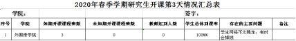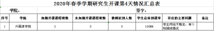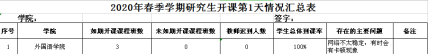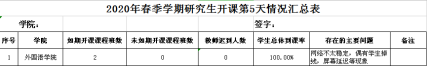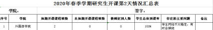 三、加強管理,確保教學成效。學院研究生管理人員每天督促和檢查各班線上教學情況,每天填寫開課情況匯總表并上報研究生院。學院還特別關注有困難的學生,采取有效措施開展幫扶工作,促進“云課堂”的有效落實,實現線上教學的最優化。