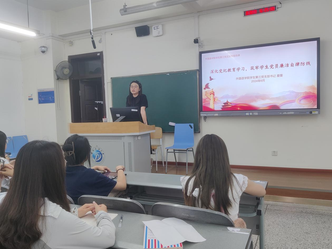 為深入學習貫徹習近平總書記關于黨紀學習教育重要講話和重要指示精神,進一步增強學習《共產黨員紀律必修課》的政治自覺和思想自覺,督促引導黨員同志遵紀守法、廉潔自律,推動全面從嚴治黨縱深發展。2024年6月27日下午,我院學生第三黨支部在思學樓B202開展黨紀黨規教育主題活動。支部書記夏蕾擔任此次黨紀黨規主題教育主講人。