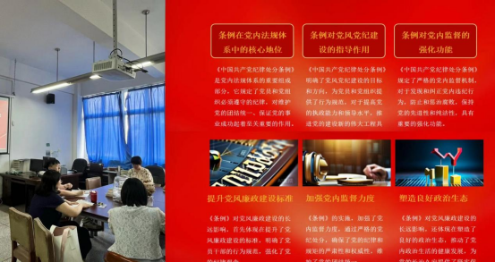魏夢瑩首先指出,《條例》的制定是基于我國實際條件以及黨內發展需求的一項重要舉措,其核心目的在于強化黨內紀律約束,確保每一位黨員嚴格遵守黨的章程和各項規定,維護黨的團結統一。這一《條例》的出臺,旨在進一步加強黨風廉政建設,確保中國共產黨始終是中國特色社會主義事業的堅強領導核心。接著,支部書記強調了《條例》在黨內法規體系中的核心地位。《條例》不僅是這一體系的重要組成部分,而且規定了每位黨員和黨組織必須遵守的紀律,對于維護黨的團結統一、確保黨的事業成功推進具有至關重要的作用。