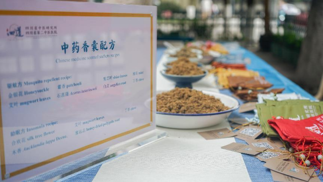 活動現場擺放了許多藿香、艾葉、白芷、藥酒,獨特的香氣縈繞四周。護理人員一邊教中外學生制作香囊,一邊介紹說,不同的香囊有不同的作用,有的可以提神,有的可以驅蚊,有的可以防蟲蛀。