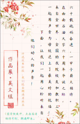 本次大賽的網絡投票環節也得到了全球校友、全國外語院校師生及本校師生的積極關注,數千網友為朗誦作品投出了寶貴的一票。來自西南石油大學外國語學院的聲音為母校送上的祝福在全世界流傳。