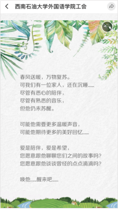 雖然張老師暫時(shí)還未回到我們身邊,但是我們會(huì)把大家對(duì)他的想念和呼喚帶去他身邊。謝謝所有關(guān)心張老師的朋友們,外國(guó)語(yǔ)學(xué)院工會(huì)將繼續(xù)“喚”行動(dòng),希望大家能夠持續(xù)關(guān)注張老師的病情,關(guān)心和幫助這個(gè)家庭!