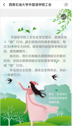 2018年年初,在外國(guó)語(yǔ)學(xué)院領(lǐng)導(dǎo)及全院老師的支持下,由外國(guó)語(yǔ)學(xué)院工會(huì)發(fā)起的“喚”行動(dòng)正式啟動(dòng)。本活動(dòng)由學(xué)院教師自愿參加,匯聚集體的力量,寄望老師們一次次的呼喚傳遞溫暖,喚醒沉睡近兩年的我院教師——張如貴。