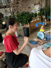 畫筆?顏料?這些曾經只屬于小孩子的創意繪畫材料,如今卻拿在了老師們的手中。“藝術家們”神情專注,在感受色彩帶來的愉悅同時,盡力展現自己的才華和實力。不一會兒,一個個平白無奇的小原木片就成了一件件心愛的藝術品。