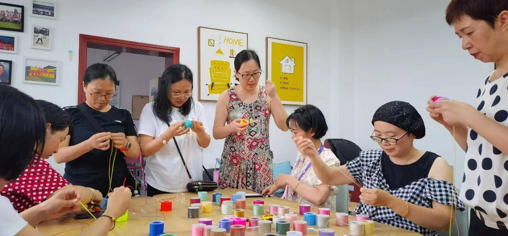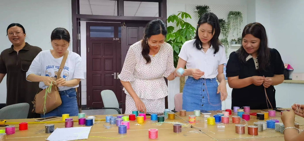 活動現場布置溫馨而富有創意。桌子上擺滿了五顏六色的編織玉線,營造出一種溫馨而充滿藝術氣息的氛圍?;顒娱_始后,Lucky手作社的幾位資深成員帶領大家進行手鏈編織的基礎教學。她們耐心地向大家講解了手鏈編織的基本技巧和步驟,并現場示范了幾種常見的編織方法。在她們的指導下,參與的教師們紛紛動手嘗試,現場氣氛熱烈,大家在學習和實踐中互相交流、互相幫助。