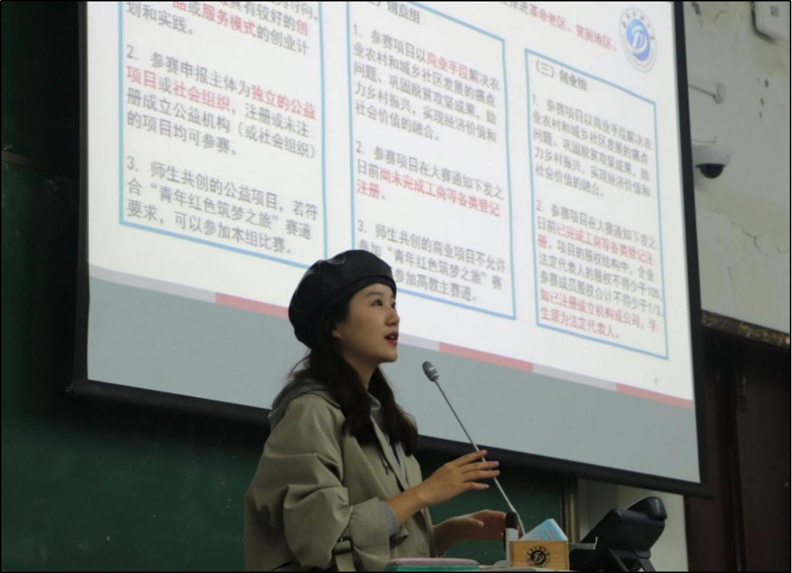 會上,王晶同學就課外學術作品競賽項目類別、參賽條件、團隊組建等重點內容進行了詳細解讀,并結合個人參賽經驗與獲獎情況,就如何選題、如何撰寫一篇高質量的參賽項目申報書給同學們進行了深入細致的講解。她指出參加創新創業比賽,不僅僅是為了獲得獎項,而是在參與比賽的過程中,鍛煉個人能力,錘煉意志品質,提升個人綜合素質,為畢業后走向職場打牢基礎。王晶鼓勵同學們積極參與到挑戰杯、創青春等比賽中來,從優秀作品中汲取參賽備賽經驗。同時,學院也將一如既往地從制度和經費等方面給予相應支持和保障。